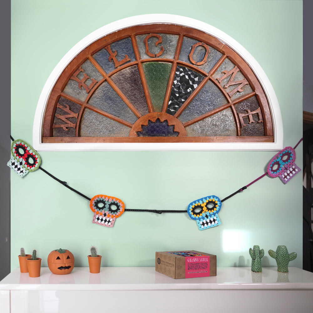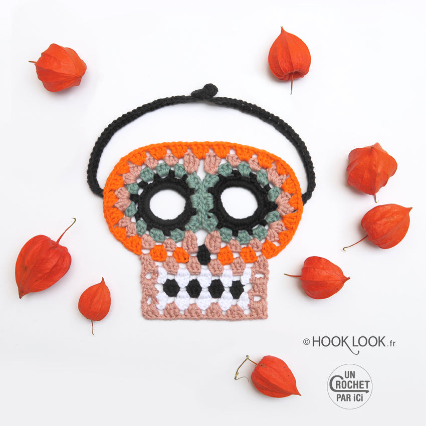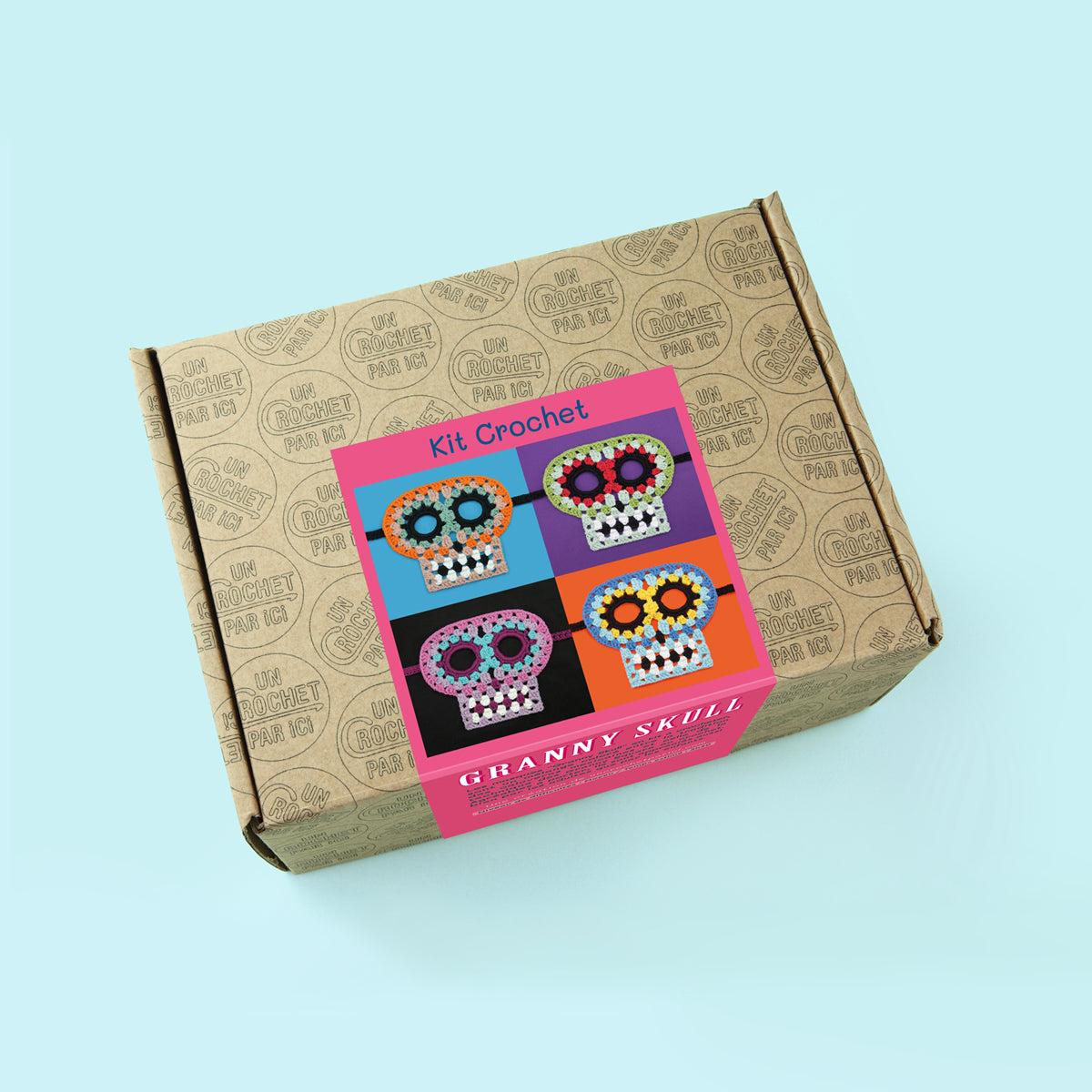• Le kit "Granny Skull" permet de crocheter soi-même un masque en forme de tête de mort de la couleur de votre choix parmi celles qui sont proposées ici.